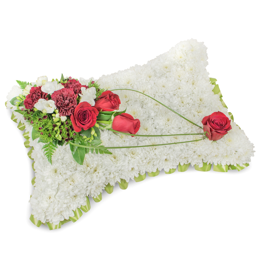 Express your sincere sympathies with our premium flower arrangement, featuring pristine white chrysanthemums, vibrant red roses, aromatic white freesias, bold dark red carnations, elegant dianthus, and lush bear grass.